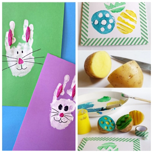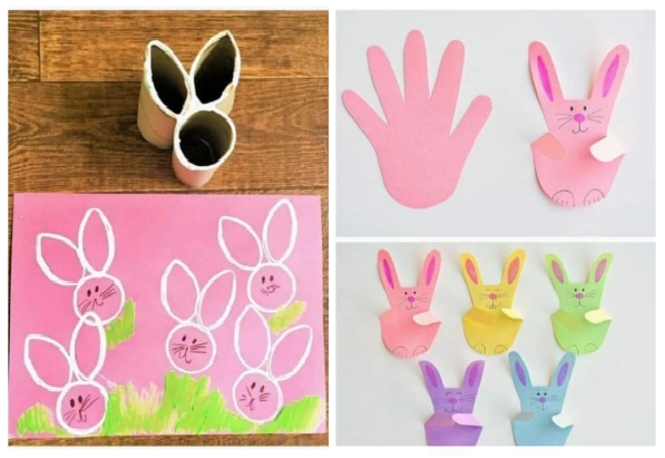 np. odciskając małą rączkę dziecka i domalowując oczy, nos, wąsy, żeby powstał króliczek (jak na zdjęciu poniżej), można zrobić stemple z ziemniaka, wykorzystać rolkę papieru, itp.