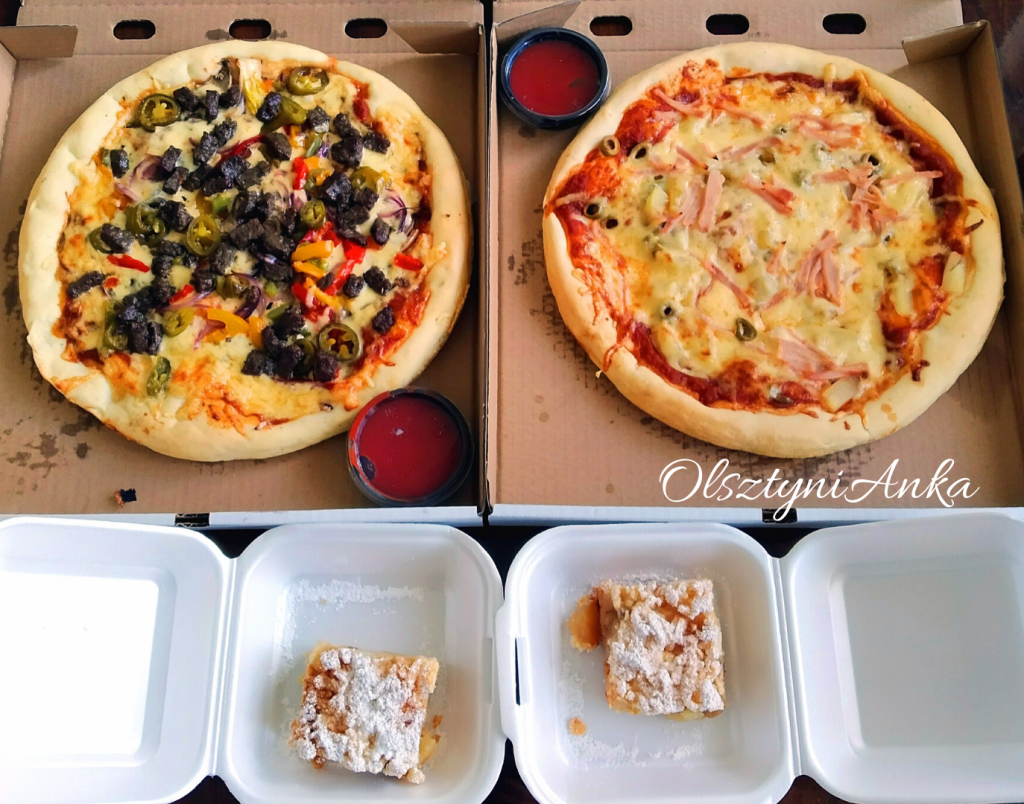 Zamówiliśmy z restauracji Via Napoli festiwalową pizzę mięsną z marynowaną wołowiną i jalapeno 🥩🧅🌶 , pizzę Hawajską oraz szarlotki „cegiełki” 🙂