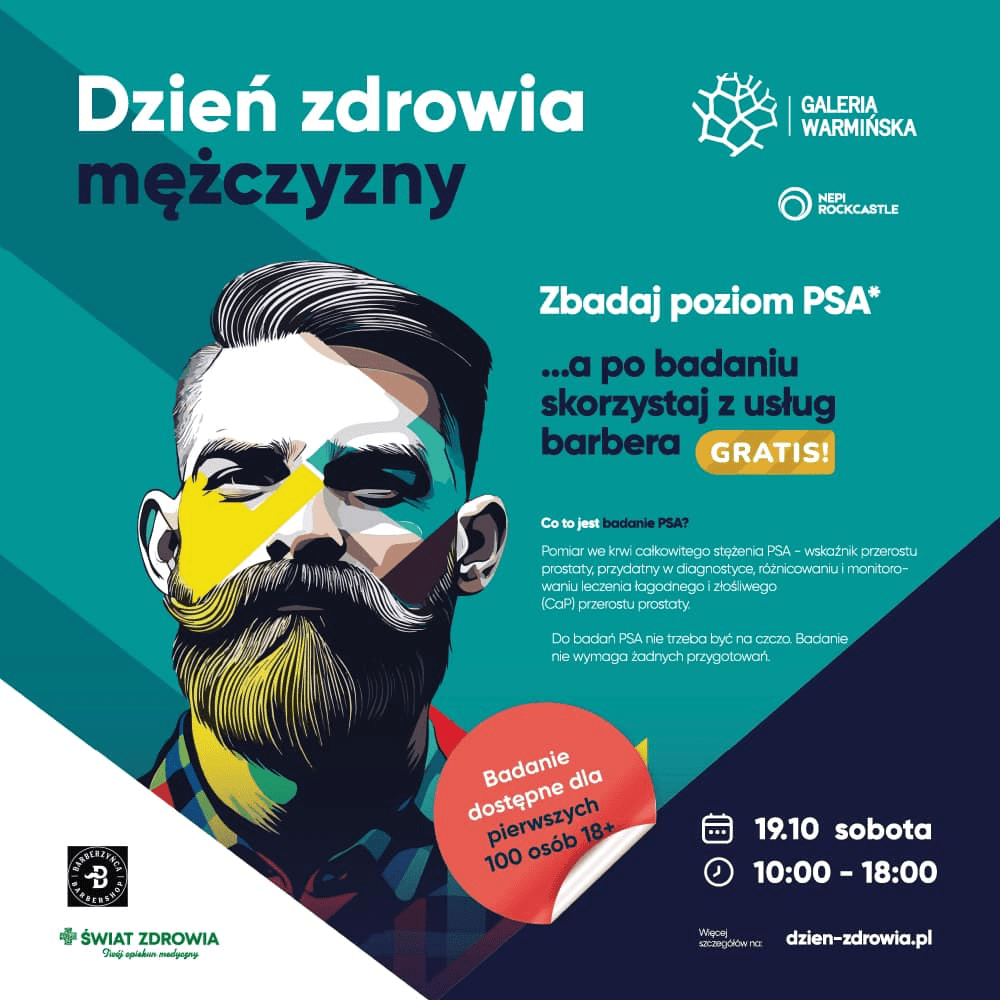 10.00-18.00 zapraszamy mężczyzn na bezpłatne badania profilaktyczne. Celem akcji „Dzień Zdrowia Mężczyzny” jest zwiększenie świadomości na temat chorób jąder i prostaty oraz zachęcenie do samokontroli w tym zakresie.
