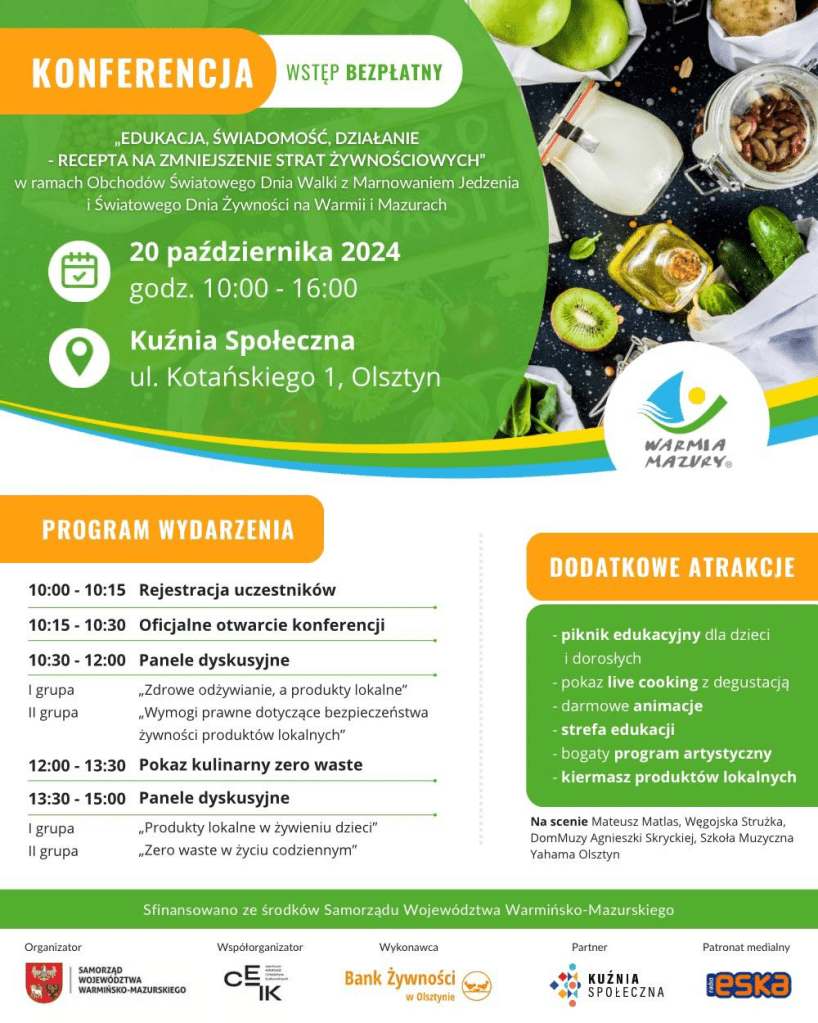 10.00-16.00 konferencja „EDUKACJA, ŚWIADOMOŚĆ, DZIAŁANIE – RECEPTA NA ZMNIEJSZENIE STRAT ŻYWNOŚCIOWYCH” w ramach Obchodów Światowego Dnia Walki z Marnowaniem Jedzenia i Światowego Dnia Żywności na Warmii i Mazurach (bezpłatne)