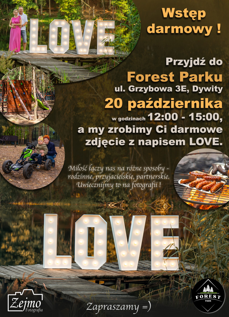 12.00-15.00 darmowe zdjęcia z bliską Ci osobą przy napisie LOVE w Forest Park Dywity (zapoznaj się z warunkami)