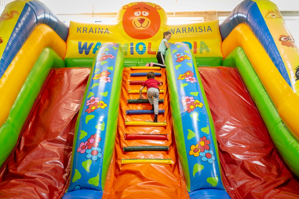 Strefa trampolin z dmuchańcem, strefa wrotek i ścianka wspinaczkowa.