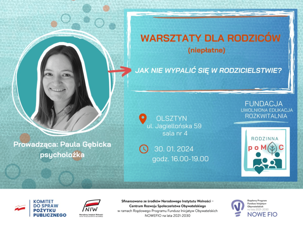 16.00-19.00 Warsztaty dla rodziców – „Jak nie wypalić się w rodzicielstwie?” (bezpłatne) Fundacja Uwolniona Edukacja Rozkwitalnia