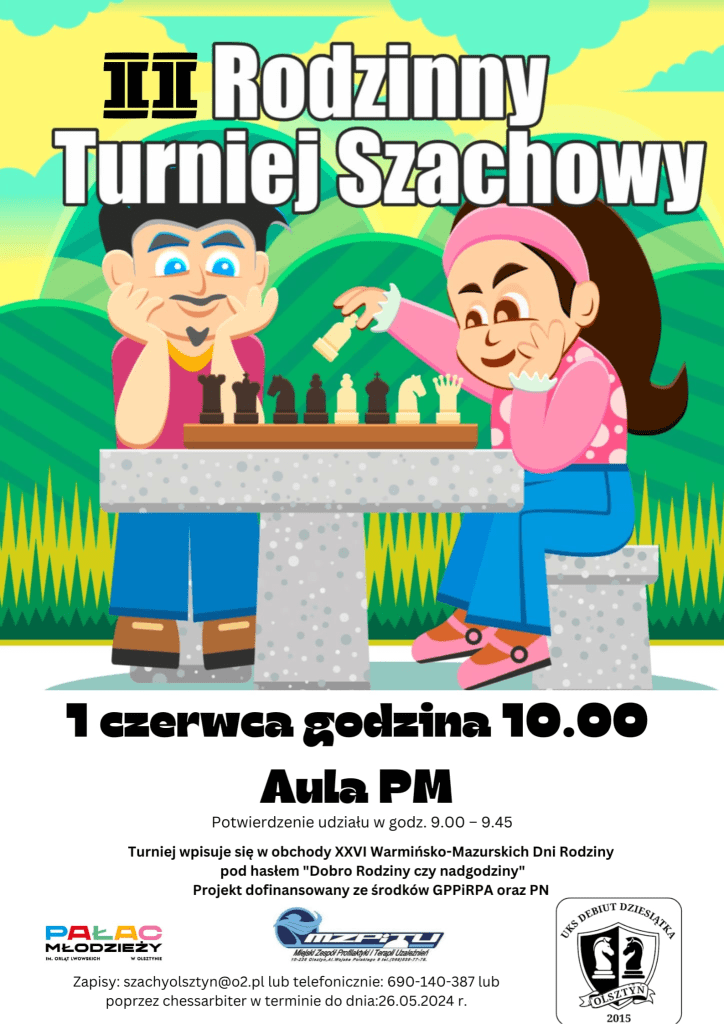 Serdecznie zapraszamy na „II Rodzinny Turniej Szachowy”, który odbędzie się 1 czerwca o godz. 10:00 w Pałacu Młodzieży w Olsztynie. Wstęp wolny