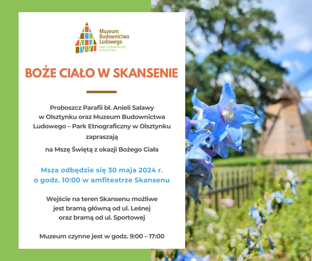 Proboszcz Parafia bł. Anieli Salawy w Olsztynku oraz Muzeum Budownictwa Ludowego – Park Etnograficzny w Olsztynku zapraszają na Mszę Świętą z okazji Bożego Ciała ![]()