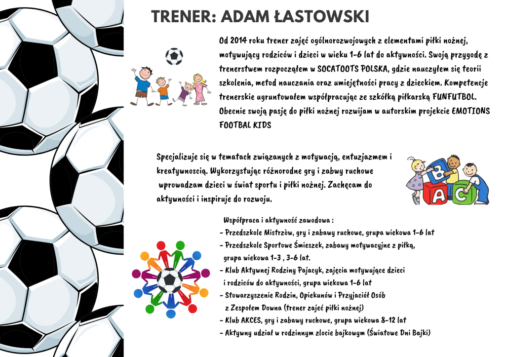 To część ruchowa, którą prowadzi trener Adam. Podczas zabaw z wykorzystaniem różnych akcesoriów (piłki, piankowe kostki, „jeże”, materace itp.) ćwiczona jest koordynacja, równowaga, odwaga, rywalizacja a nawet cierpliwość i dyscyplina. Jeśli tylko pogoda pozwoli zajęcia będą odbywały się na zewnątrz.